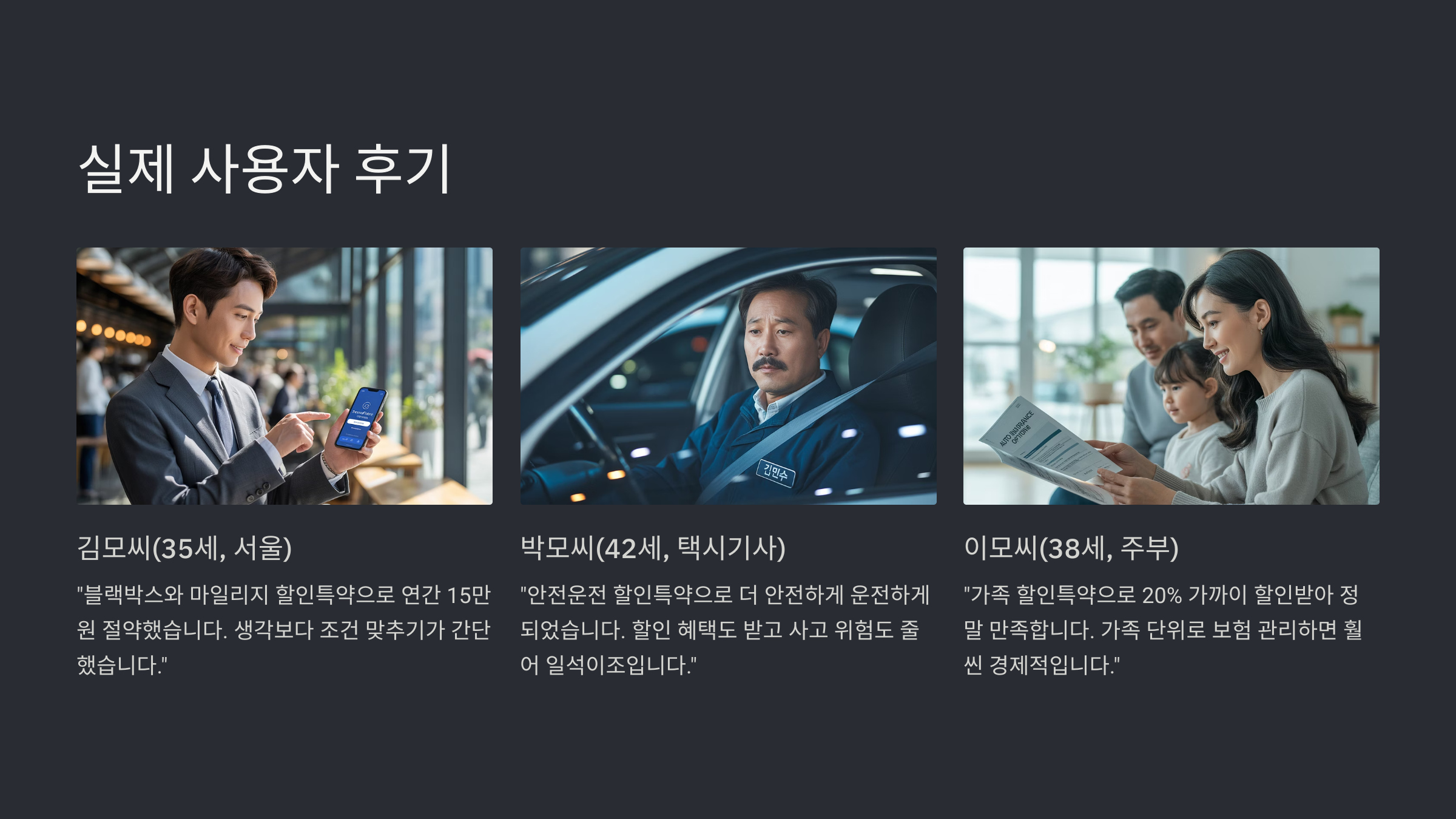 대구의 주부 이모씨(38세)는 가족 할인특약에 대해 "남편 차와 제 차 모두 같은 보험사에서 가입하니까 20% 가까이 할인받아서 정말 만족한다"며 "아이들이 커서 운전면허를 따게 되면 추가 할인도 받을 수 있어서 기대된다"고 말했어요. 가족 단위로 보험을 관리하면 개별 가입보다 훨씬 경제적이라는 것을 실감하고 있다고 하네요.